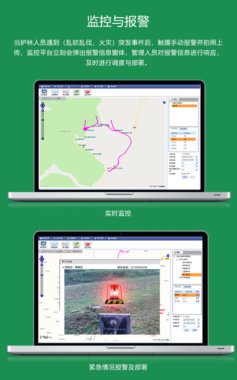 當(dāng)護(hù)林人員遇到(亂砍亂伐,火災(zāi))突發(fā)事件后,觸摸手動(dòng)報(bào)警并拍照上傳,監(jiān)控平臺(tái)立刻彈出報(bào)警信息窗體,