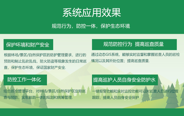 通過《林業(yè)/景區(qū)/自然保護(hù)區(qū)GPS巡檢管理系統(tǒng)》,規(guī)范巡檢行為,強(qiáng)化巡查質(zhì)量,實(shí)現(xiàn)林業(yè)/景區(qū)/自然保護(hù)區(qū)防控工